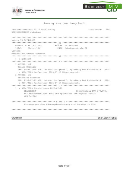 Die modernen Doppelhaushälften entstehen in der Lobmingerstraße 22, 8734 Lobmingtal, im Ortsteil Großlobming. Das Grundstück liegt in einer ruhigen Wohnstraße, die überwiegend von Einfamilien- und Doppelhäusern geprägt ist. Die Umgebung wirkt gepflegt und familienfreundlich und bietet gleichzeitig kurze Wege in die umliegenden Ortschaften. Alltägliche Besorgungen können in der näheren Umgebung erledigt werden. Lebensmittelmärkte, Bäckerei, Banken, Gastronomiebetriebe und sonstige Nahversorger befinden sich im Ort beziehungsweise in Knittelfeld und sind in etwa 5 bis 10 Autominuten erreichbar. Kindergarten und Volksschule sind in wenigen Minuten mit dem Auto erreichbar. Weiterführende Schulen, diverse Bildungseinrichtungen und ein breiteres Angebot an Ärzten und Apotheken befinden sich vor allem in Knittelfeld und Judenburg. Die Anbindung an den überregionalen Verkehr ist sehr gut. Über die Lobmingerstraße und die nahe gelegene S36 Murtal Schnellstraße sind Knittelfeld, Judenburg und Zeltweg rasch erreichbar. Dadurch ist die Liegenschaft sowohl für Pendler als auch für Familien attraktiv, die eine gute Verkehrsanbindung schätzen und dennoch ruhig im Grünen wohnen möchten. Im weiteren Umfeld profitieren Sie von der wirtschaftlich starken Region Murtal. Bedeutende Arbeitgeber aus Industrie, Automotive und Dienstleistung sind im Raum Knittelfeld, Zeltweg und Judenburg angesiedelt. Der nahe gelegene Red Bull Ring in Spielberg sorgt zusätzlich für eine hohe Bekanntheit der Region und bietet ein abwechslungsreiches Freizeit- und Eventprogramm. Rad- und Wanderwege, Ausflüge in die umliegenden Berge sowie gut erreichbare Skigebiete wie etwa in der Gaal oder im Lachtal runden das Freizeitangebot ab. Insgesamt verbindet der Standort somit naturnahes Wohnen mit guter Infrastruktur und vielfältigen Freizeitmöglichkeiten.