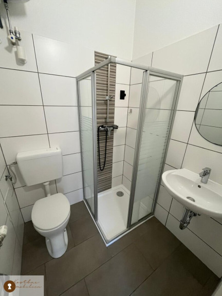 Modernes Badezimmer: Mit Dusche und WC, bereit für Ihren täglichen Frischekick.