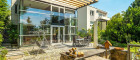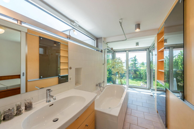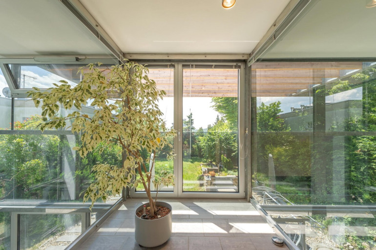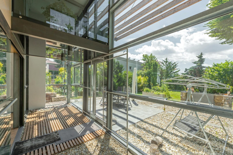 Der Garten: Der Übergang vom südseitigen Garten zum Wohnbereich, durch den verglasten hohen Wintergarten, wurde vom Architekten bewusst fließend gestaltet, sodass Naturliebhaber voll auf Ihre Kosten kommen. Über eine Terrasse gelangt man in den natürlichen Garten, der reichlich viel Fauna & Flora über die Jahreszeiten bietet.