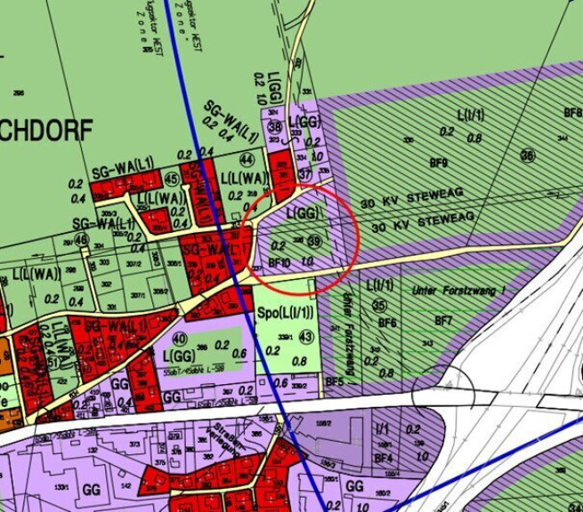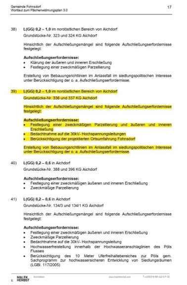 Laut aktuellem Flächenwidmungsplan der Gemeinde Fohnsdorf (Version 3.0 idgF, basierend auf dem Stmk. Raumordnungsgesetz 1974) ist das Grundstück als "Aufschließungsgebiet – Gewerbegebiet" mit entsprechender Bebauungsdichte gewidmet. Ein rechtskräftiger Bebauungsplan liegt derzeit nicht vor, wodurch sich flexible Entwicklungsmöglichkeiten im Rahmen der geltenden Bestimmungen ergeben. Die Aufschließungskriterien sind beigefügt.