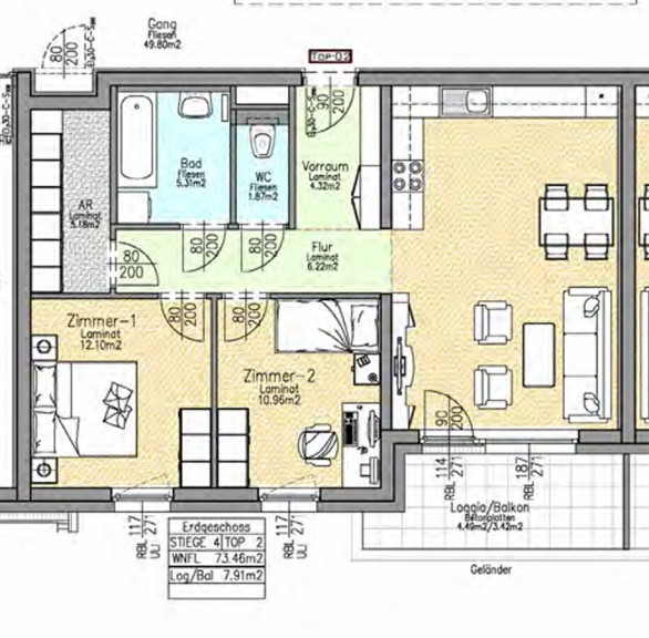 Die Wohnung verfügt über ca. 73 m² Nutzfläche und einen Balkon. Die Wohnräume sind mit Laminatboden, die Nassräume mit Fliesen ausgestattet. 3-fach-verglaste Fenster sorgen für angenehmes Raumklima.