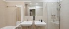 Beim Betreten der Wohnung gelangen Sie in einen großzügigen Vorraum, der durch eine kleine Trennwand strukturiert ist und viel Platz für eine Garderobe bietet. Gleich links befindet sich ein praktischer Abstellraum mit Waschmaschinenanschluss. Daran anschließend liegen ein separates WC mit Handwaschbecken sowie das Badezimmer, welches mit zwei Handwaschbecken, Badewanne und einer Dusche ausgestattet ist.