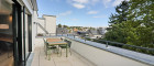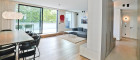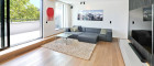Der großzügige Wohnbereich bildet das Herzstück der Wohnung und verbindet sich nahtlos mit der maßgefertigten Designküche, ausgestattet mit Gaggenau- und Miele-Geräten sowie einer tiefschwarzen Granit-Arbeitsplatte Nero Assoluto. Von hier aus gelangt man direkt auf die rund 20 m² große Terrasse mit offenem Weitblick.