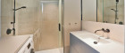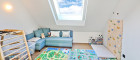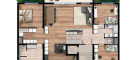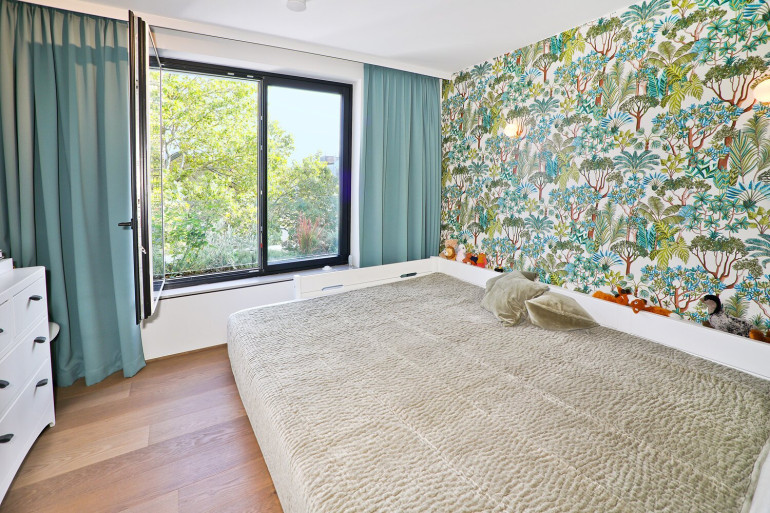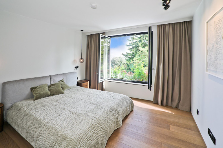 Der Elternbereich ist über eine dezent integrierte Pivot-Türe zugänglich und umfasst einen Schrankraum, ein Schlafzimmer sowie ein exklusiv ausgestattetes Badezimmer mit begehbarer Dusche und Badewanne. Auf der gegenüberliegenden Seite der Wohnung befinden sich zwei weitere Zimmer, ein Gäste-WC sowie ein zweites Badezimmer, wodurch eine klare und gut nutzbare Zonierung entsteht.