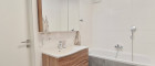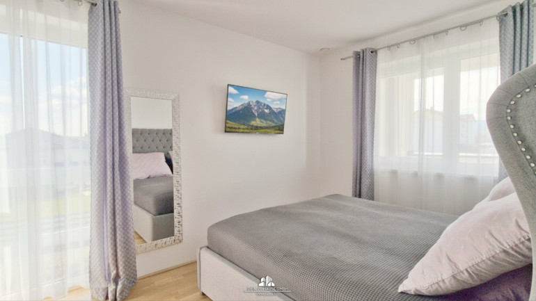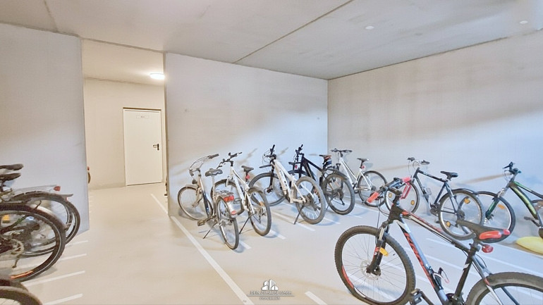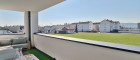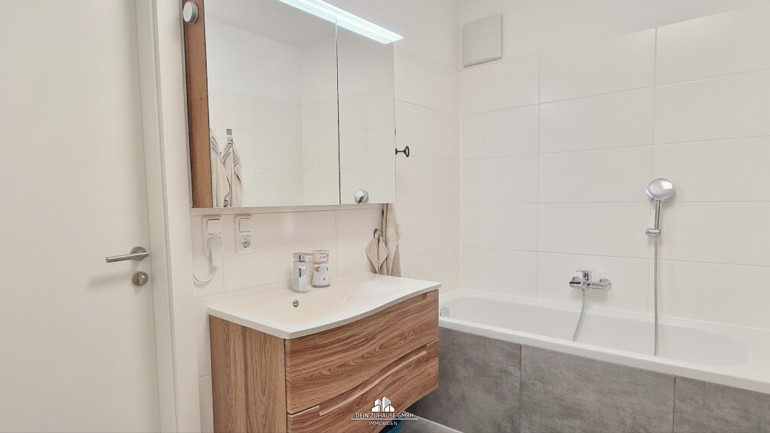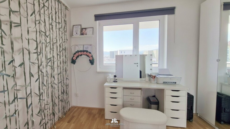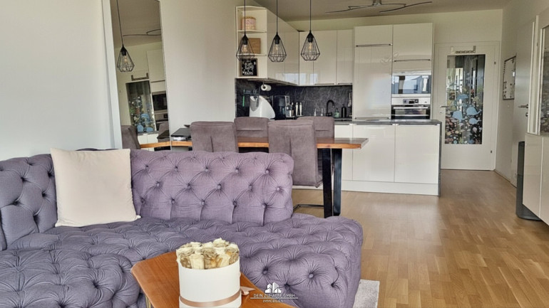 Große Fenster, elektrische Jalousien und ein durchdachtes Design schaffen eine ideale Wohlfühlatmosphäre. Die Wohnraumlüftung sorgt für Luftaustausch und an schönen Tagen genießen Sie die Wohnraumerweiterung durch die Loggia mit Grünblick.