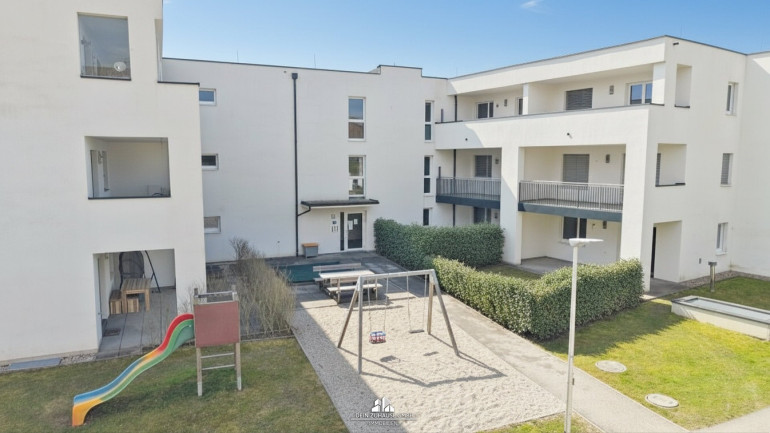 Direkt vor dem Haus befindet sich eine Gemeinschaftsfläche mit Kinderspielplatz und Sandkasten, ideal für Familien mit kleinen Kindern, die hier sicher spielen und wachsen können.