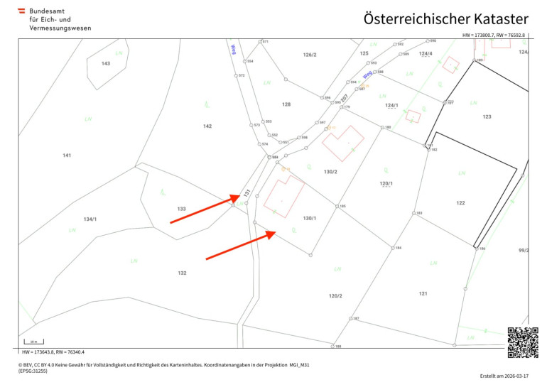Auch das Grundstücksprofil ist ein wesentliches Asset dieser Liegenschaft. Das Grundstück 130/1 mit 1.072,6 m² ist vollständig als A1 Dorfgebiet gewidmet und damit Bauland. Auf diesem Grundstück befinden sich das Wohnhaus, die Garage und das Gartenhaus. Zusätzlich gehört das Grundstück 131 mit 127,5 m² zur Liegenschaft. Dieses zusätzliche Grundstück ist kein Bauland, sondern als Land- bzw. forstwirtschaftliche Nutzfläche ausgewiesen. Nach deinen Angaben wurde es vom Eigentümer dazugekauft und bislang dazu genutzt, Besucherfahrzeuge abzustellen, was in der praktischen Nutzung einen spürbaren Mehrwert für Gäste, Familie oder zusätzliche Stellmöglichkeiten bietet.