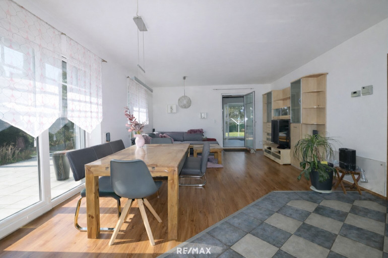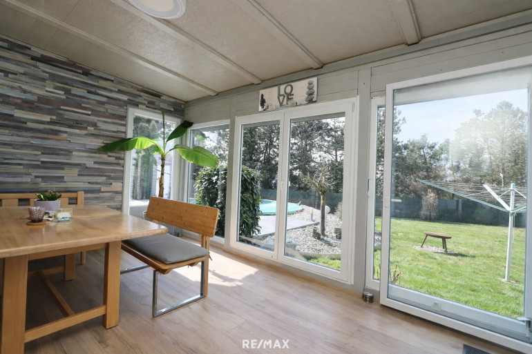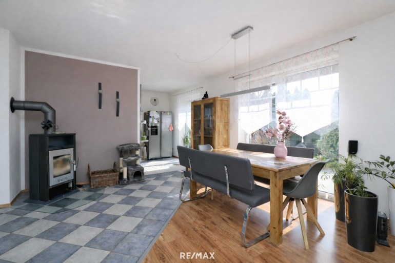 Der zentrale Lebensmittelpunkt des Hauses: Ein großzügiger Wohn-, Ess- und Küchenbereich mit gemütlichem Kamin bildet das Herzstück und geht fließend in den lichtdurchflutete Wintergarten, der den Wohnbereich erweitert und zu jeder Jahreszeit einen angenehmen Rückzugsort bietet, über. Ergänzt wird diese Ebene durch einen einladenden Vorraum, eine praktische Speis, ein WC, das Stiegenhaus sowie ein weiteres Zimmer, das sich ideal als Büro oder Gästezimmer nutzen lässt.
