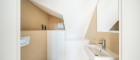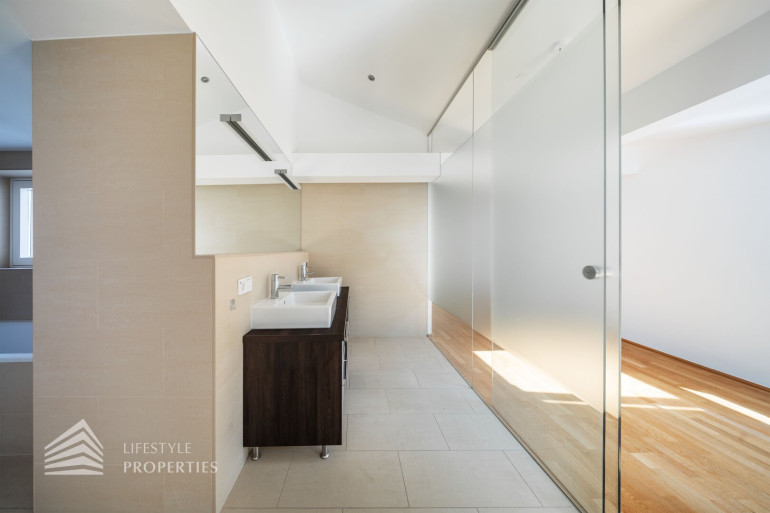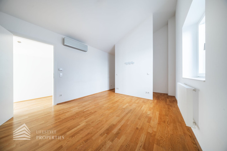 Die Maisonette gliedert sich in der unteren Ebene in ein geräumiges Entrée, einen großen Salon mit offener Küche, der genügend Platz für einen Esstisch und eine gemütliche Wohnecke bietet, die Küche ist vollständig ausgestattet. Das große Zimmer ist eine Galerie, die sich im oberen Teil befindet und im unteren Bereich mit einem Schrankraum und en-suite Bad mit Badewanne, zwei Waschbecken und WC ausgestattet ist. Ein weiteres Zimmer mit en-suite Bad sowie noch ein Zimmer, einen Abstellraum und zwei separate WCs finden Sie auf der unteren Ebene. In der oberen Ebene befindet sich eine weitere Galerie mit Zugang zu den zwei Terrassen, welche teilweise einen wunderschönen Blick auf den Stephansdom bieten. Des Weiteren gibt es im oberen Stockwerk ein weiteres Bad mit Dusche und WC.