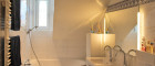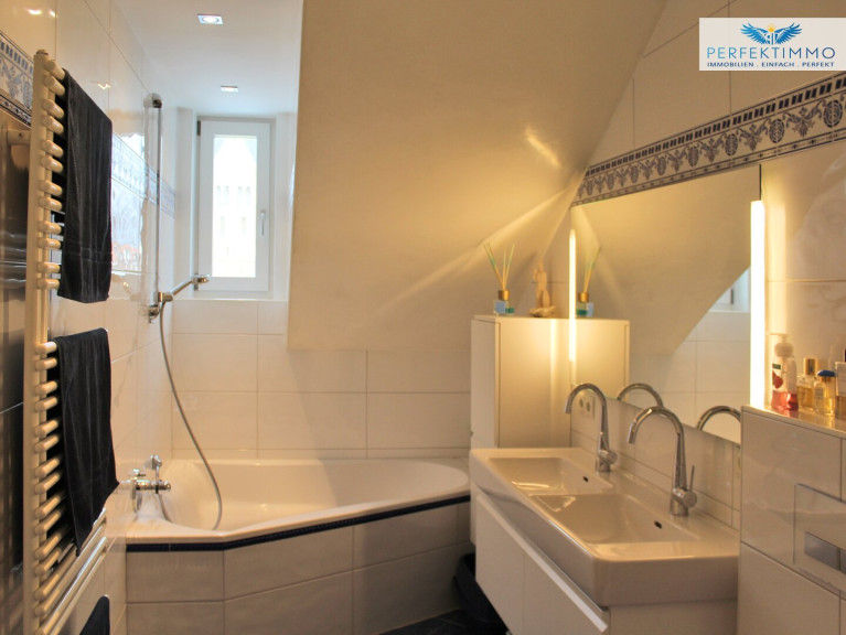 Das Badezimmer ist ausgestattet mit hochwertigen Fliesen von Villeroy&Boch und verfügt über eine komfortable elektrische Fußbodenheizung. Weiters gibt es eine Sonos-Anlage im Bad, um entspannt Musik hören zu können, während man in der großen Eckwanne den Alltag vergisst.