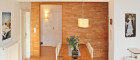 Beim Umbau wurde viel Wert auf Natürlichkeit gelegt, was unter anderem in einem kanadischen Ahornboden, einer Spaltholzwand in Tanne (Wohnzimmer) und einem Vollholz-Einbauschrank aus Wildbuche (Schlafzimmer) zum Ausdruck kommt. Die Küche wurde von der Tischlerei Lüth gebaut und mit einer brasillianischen Granitplatte Macaruba der Fa. Steinreich veredelt.