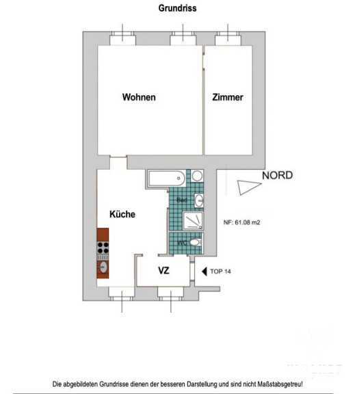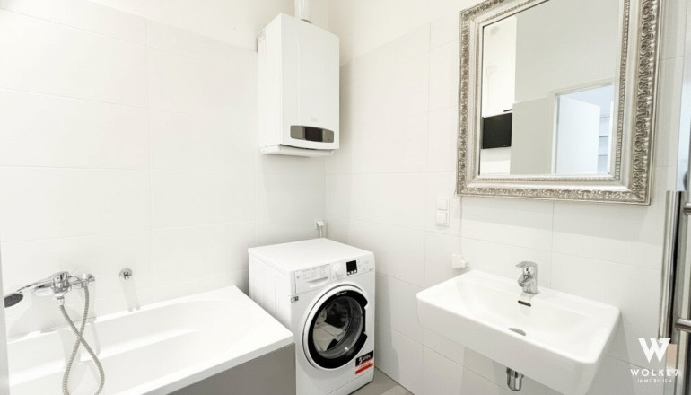 Der großzügige Vorraum bietet Platz für einen Essbereich. Wohn- und Schlafzimmer sind westseitig ausgerichtet und dadurch besonders hell. Die neuwertige Küche ist separat und komplett ausgestattet. Badezimmer mit Badewanne und Dusche, WC separat.