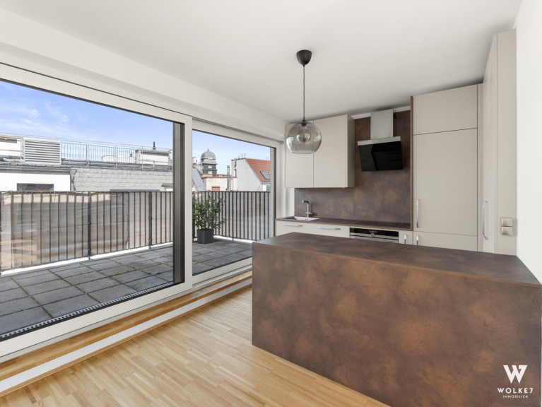 Vom Wohnzimmer gelangt man in die moderne Wohnküche samt Kücheninsel – ein idealer Ort zum Kochen, Entspannen und Wohlfühlen. Von der Küche aus gelangt man direkt auf die großzügige Dachterrasse.
