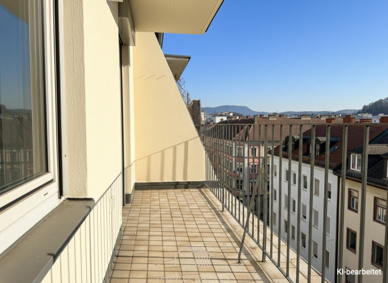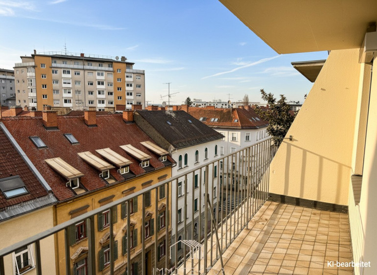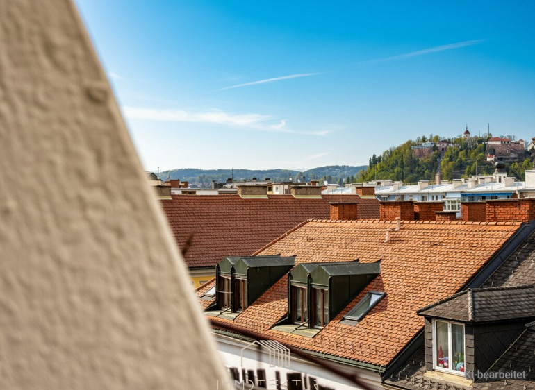 Ein echtes Highlight ist die großzügige Dachterrasse mit wunderschönem Blick auf den Schlossberg. Ob Frühstück in der Morgensonne, entspanntes Arbeiten im Freien oder ein Glas Wein am Abend – hier genießen Sie Ihr persönliches Freiluft-Refugium über den Dächern der Stadt. Die Ausrichtung sorgt dafür, dass Sie die ersten Sonnenstrahlen des Tages ebenso auskosten können wie die kühlende Atmosphäre der Abendstunden.
