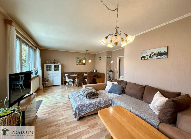 Besonders schön zeigt sich das Haus in der Verbindung von Innen- und Außenraum: Vom Wohnbereich aus gelangt man in den Terrassen- und Gartenbereich, der das Wohnen auf angenehme Weise erweitert. Ein Teil der Terrasse wurde verglast und wintergartenähnlich gestaltet, wodurch ein geschützter, lichtdurchfluteter Bereich entstanden ist, der sich hervorragend als gemütlicher Aufenthaltsplatz nutzen lässt – sei es für den Morgenkaffee, entspannte Stunden mit Blick ins Grüne oder als geschützter Übergang zwischen Haus und Garten.