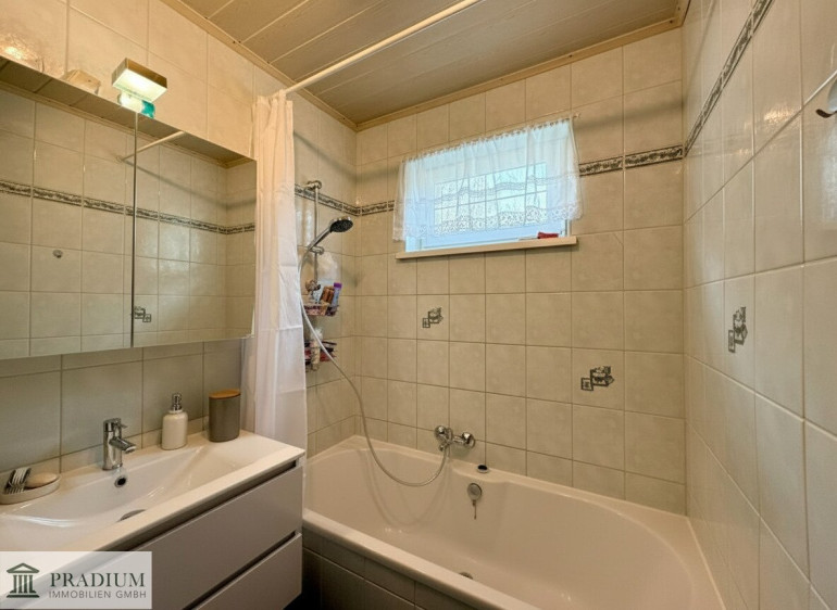 Fliesen, Laminatboden, Einbauküche, Bad mit Fenster