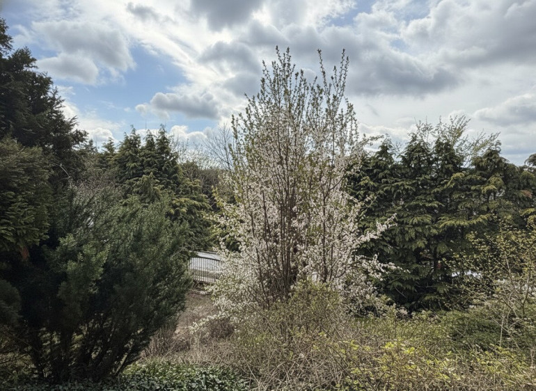 Das Grundstück selbst liegt leicht erhöht, fast wie ein stiller Beobachter seiner Umgebung, und genau dort, wo es oben eben wird, steht das Haus – eingebettet, zurückgenommen und doch mit einer Präsenz, die man nicht übersehen kann. Die Zufahrt führt hinauf, ganz selbstverständlich, und während man ankommt, entsteht dieses leise Gefühl von Abstand zum Alltag. Ein Zaun rahmt das Grundstück, dahinter eine gewachsene Hecke, die aktuell vielleicht nicht ihre schönste Form zeigt, aber genau dieses Versprechen in sich trägt, wieder zu dem zu werden, was sie einmal war: ein natürlicher Schutzraum, der Privatsphäre schenkt, ohne sich abzuschotten.