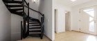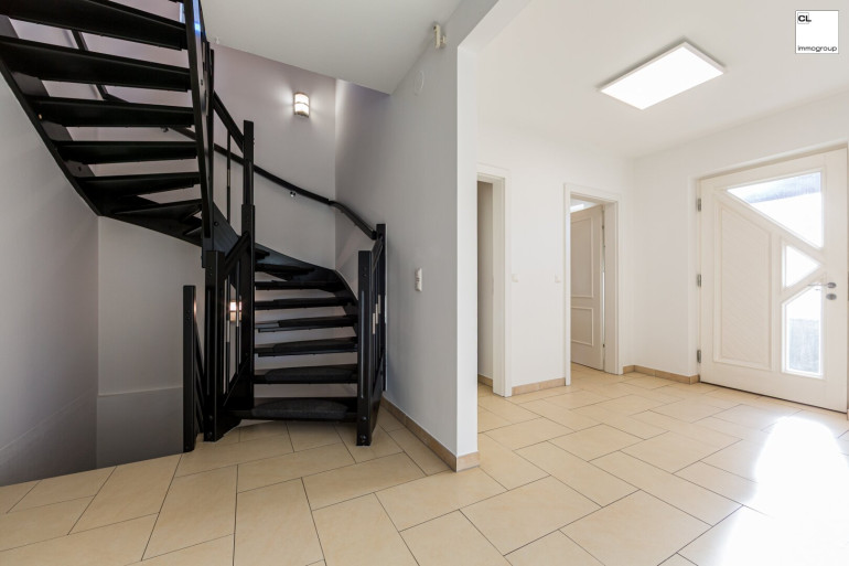 Bereits beim Betreten empfängt Sie ein freundlicher, heller Eingangsbereich. Von hier aus führt eine elegant in Schwarz gehaltene Holztreppe sowohl in das Obergeschoss als auch in den teilunterkellerten Bereich des Hauses.
