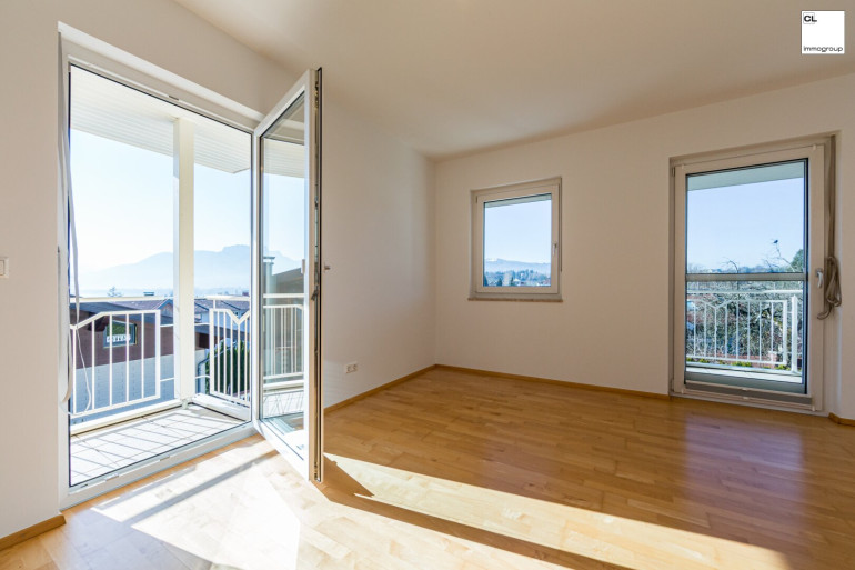 Zwei gemütliche Schlafzimmer mit jeweils rund 15 m² sowie das großzügige Master-Schlafzimmer mit etwa 23 m² bieten ausreichend Platz für individuelle Rückzugsorte und Zugang auf zwei Balkonen mit atemberaubenden Blick auf den Ortskern von Mondsee, Basilika und die traumhafte Berglandschaft. Das elegant gestaltete Badezimmer präsentiert sich als kleine private Wellness-Oase mit großzügiger Eckbadewanne, moderner Glasdusche und Doppelwaschbecken.