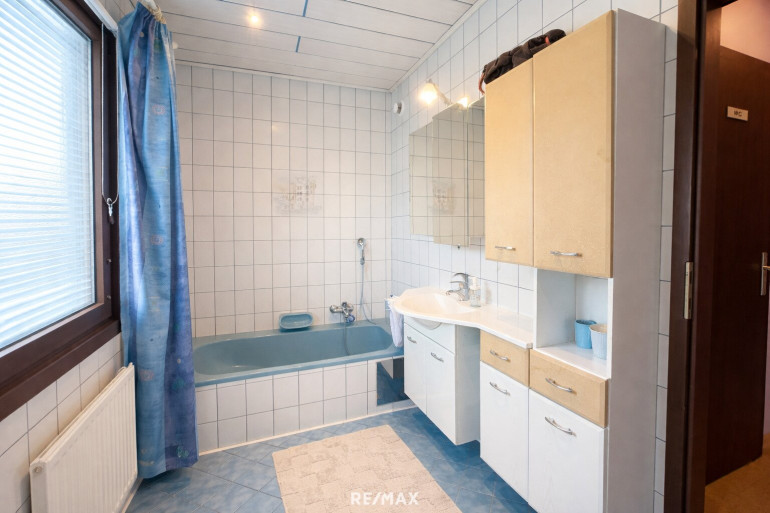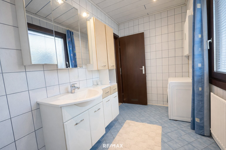 - Badezimmer mit Badewanne, Fenster (Milchglas) und Waschmaschinenanschluss