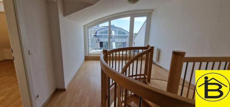Über eine Wendeltreppe gelangt man in das Obergeschoß mit einem zentralen Vorraum mit Ausgang auf die Terrasse, Badezimmer, WC sowie 2 weitere Schlafzimmer.