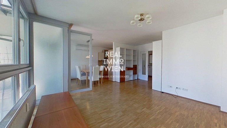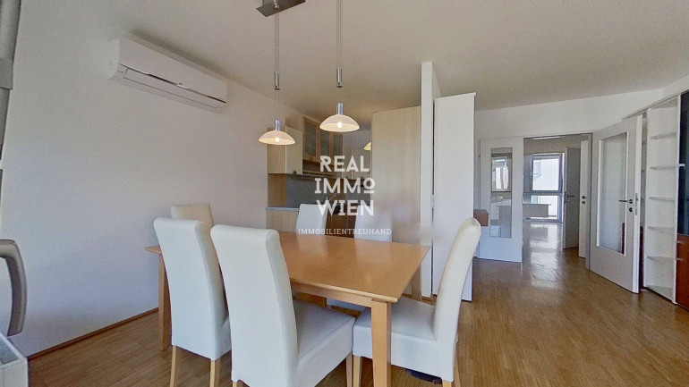 Das Herzstück der Wohnung ist das großzügige Wohnzimmer, von dem aus Sie direkt auf den nach Nord-Westen ausgerichteten Balkon gelangen – ideal, um die Abendsonne zu genießen. Für optimalen Wohnkomfort ist die Wohnung mit einer Klimaanlage ausgestattet. Im Schlafbereich wurden zudem elektrische Jalousien installiert, damit Sie die Lichtverhältnisse jederzeit bequem steuern können. Die Beheizung erfolgt effizient via Fernwärme. Die Raumaufteilung wird durch eine voll ausgestattete Küche, ein Badezimmer mit Badewanne, eine separate Toilette und einen geräumigen Vorraum perfekt ergänzt. Ein eigenes Kellerabteil mit etwa 2 m² bietet zusätzlichen Stauraum.