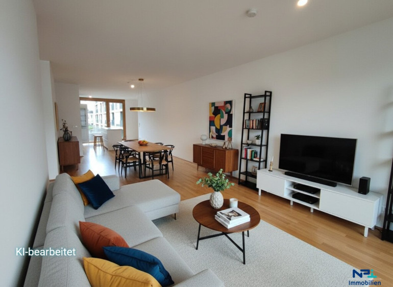 Sie betreten die Wohnung über einen großzügig gestalteten Eingangsbereich, der einen einladenden ersten Eindruck vermittelt. Von hier aus gelangen Sie linkerhand in ein separates WC, während sich geradeaus der helle, lichtdurchflutete Wohn- und Essbereich öffnet. Dieser überzeugt mit einer modernen, offenen Einbauküche, die mit hochwertigen AEG-Geräten ausgestattet ist, sowie einem direkten Zugang zur südseitig ausgerichteten Loggia. Ergänzt wird das Raumangebot durch zwei komfortable Schlafzimmer sowie ein Badezimmer mit Badewanne und WC. Von der zentralen Lage hört man im Wohnungsinneren praktisch gar nichts. Ein ca. 5 m² großes Kellerabteil sowie ein allgemeiner Fahrradraum stehen Ihnen zur Verfügung. Internetanschlüsse über Kabel sowie eine SAT-Anlage sind ebenfalls vorhanden.