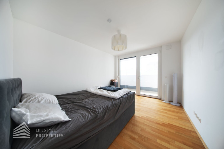Direkt von der Wohnküche aus erschließt sich ein weiteres Zimmer mit ca. 11 m², das sich ideal als Schlafzimmer, Kinderzimmer, Gästezimmer oder Home-Office eignet. Ein größeres Schlafzimmer mit ca. 13 m² ist süd-westlich ausgerichtet, vom Vorraum aus begehbar und bietet ein besonderes Highlight: den direkten Zugang zu einer zweiten Loggia, welche mit einer Fläche von ca. 6 m² zusätzlichen Freiraum sowie eine angenehme Erweiterung des privaten Wohnbereichs schafft.