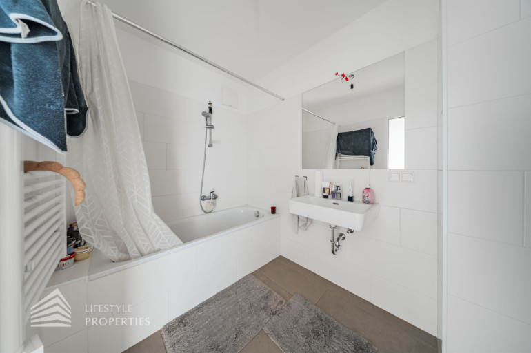 Vom Vorraum aus erreicht man außerdem das Badezimmer, das separat angelegte WC sowie einen praktischen Abstellraum mit Waschmaschinenanschluss, der zusätzlichen Stauraum innerhalb der Wohnung bietet.