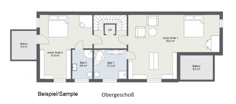 Die Zimmer werden großzügig ausgeführt und sind jeweils mit eigenem Bad und Ankleide ausgestattet.