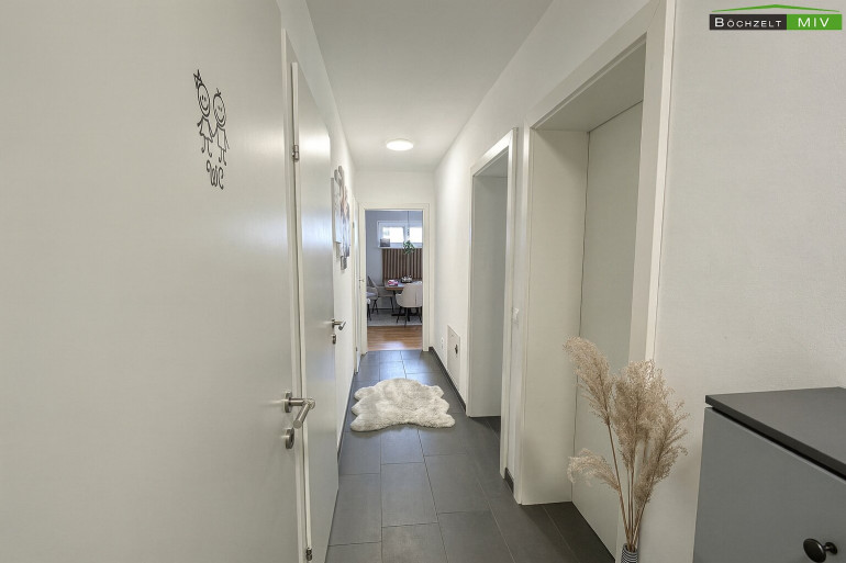 In den Wohn- und Schlafräumen ist Parkettboden verlegt, der eine behagliche Wohnatmosphäre schafft, während in Vorraum, Bad, WC und Abstellraum pflegeleichte Fliesenböden überzeugen. Die Elektroinstallation entspricht aktuellem Standard, und im Haus befinden sich ein eigener Technikraum sowie eine zentrale Übergabestation.