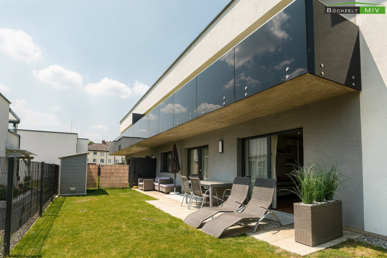 Zum Verkauf gelangt eine moderne 3-Zimmer-Gartenwohnung mit Eigengarten und Terrasse in einem kleinen Haus mit nur 4 Wohneinheiten. Die Wohnung liegt im Erdgeschoss und verfügt über eine Wohnnutzfläche von rund 74,3 m² laut Topografie. Herzstück ist der helle Wohn-Essbereich mit Zugang auf die großzügige Terrasse und in den Eigengarten. Die hochwertige Einbauküche ist im Kaufpreis von EUR 229.000,- bereits enthalten, ebenso wie zwei zugeordnete KFZ-Abstellplätze samt E-Ladestation direkt bei der Liegenschaft.