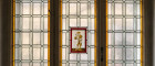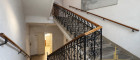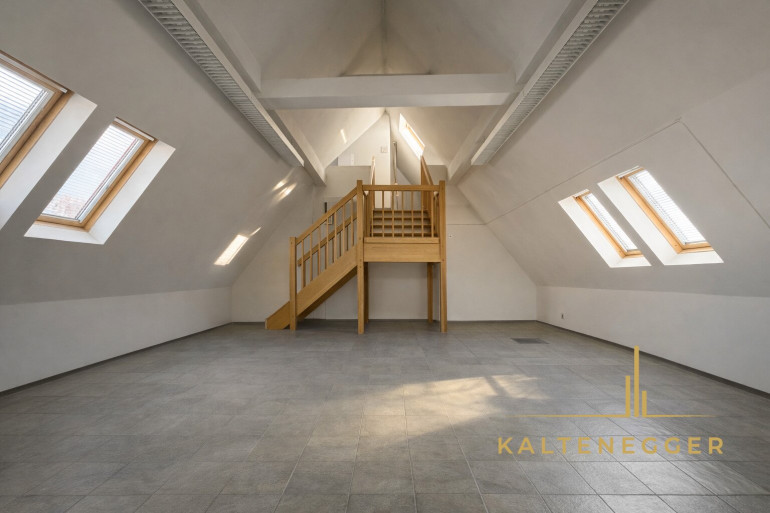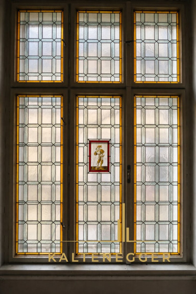 Besonders eindrucksvoll ist der westseitige Haupteingang mit vorgelagertem Stiegenhaus, ergänzt durch eine Sandsteinplastik des Heiligen Florian, des Schutzpatrons vor Feuer – ein seltenes und charmantes historisches Detail, das dem Haus zusätzliche Identität verleiht.