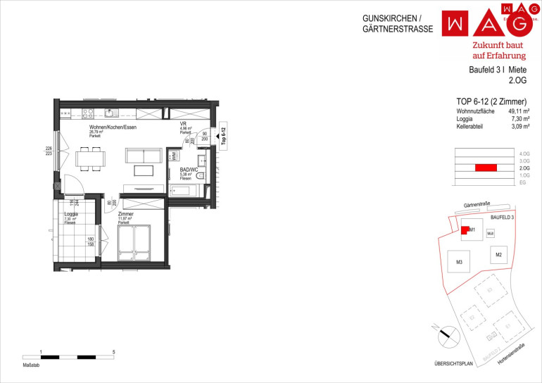 Am ehemaligen Sportplatz in der Gärtnerstraße in Gunskirchen errichtet die WAG drei moderne Wohngebäude mit insgesamt 60 geförderten Mietwohnungen und einer Tiefgarage mit 81 Stellplätzen. Die Anlage entsteht in nachhaltiger Hybridbauweise und bietet Wohnraum für unterschiedliche Lebenssituationen.