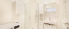 Das zeitlose Badezimmer ist mit eleganten Fliesen ausgestattet; das WC (inkl. Waschbecken) ist separat.