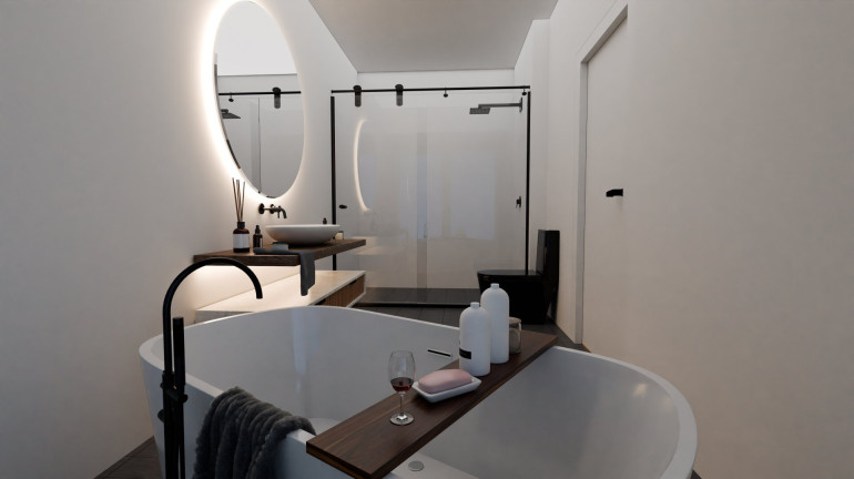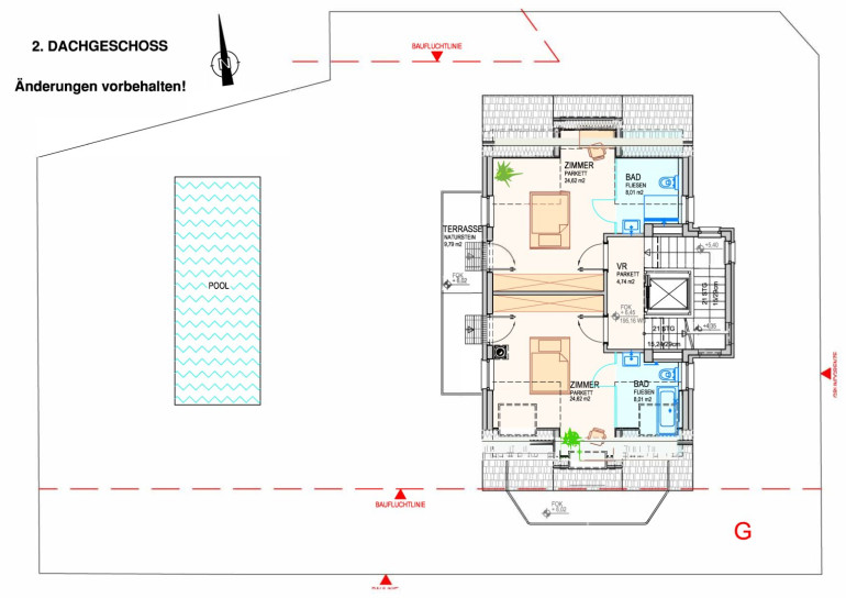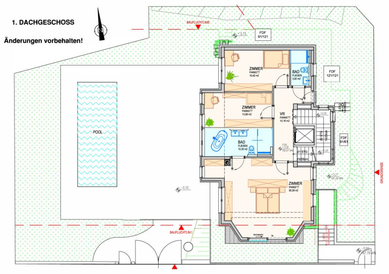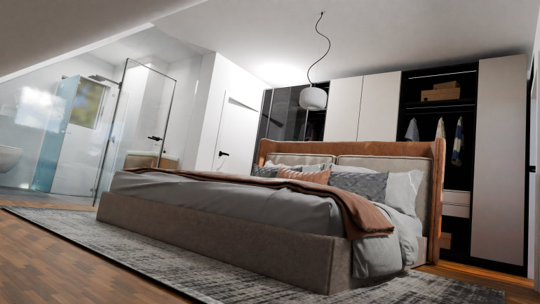 1. Dachgeschoss: Vorraum, Master Bedroom mit en-suite Bad (Dusche/ Wanne/ WC), 2 Schlafzimmer, Bad (Dusche/ WC)