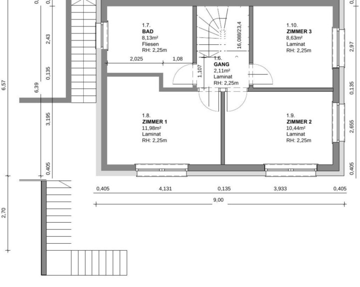 Im Obergeschoss befinden sich 3 Zimmer mit ausreichend Platz zum wohnen für die gesamte Familie. Ein modernes Badezimmer mit Badewanne lässt keine Wünsche offen. Es besteht die Möglichkeit das Bad auch en-suite auszuführen oder eine begehbare Garderobe zurealisieren.