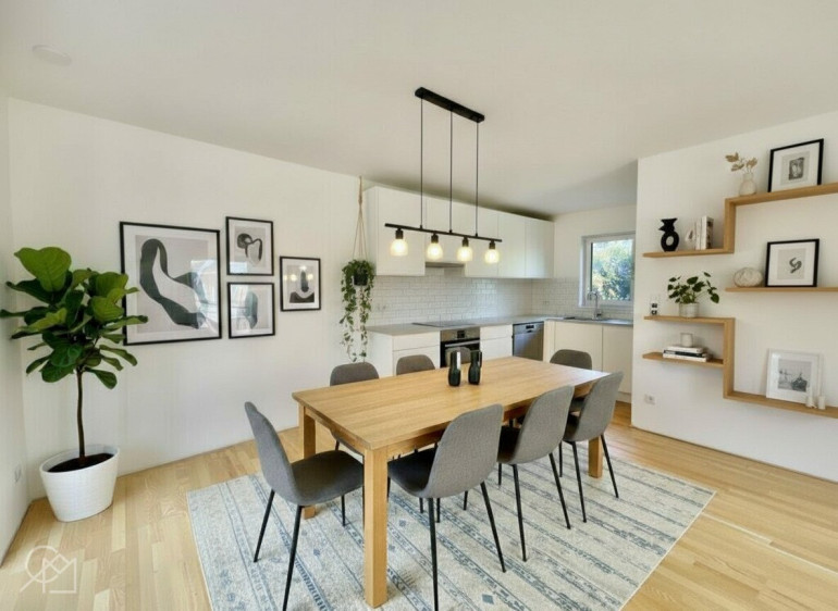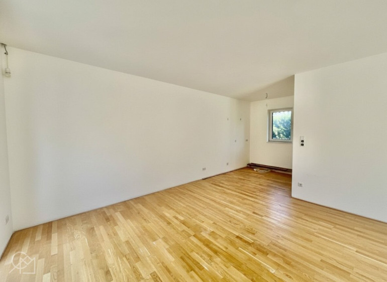 Im Erdgeschoß befinden sich ein großzügiger Wohnraum mit offener Wohnküche, sowie ein WC mit Gästehandwaschbecken und ein direkter Zugang vom Wohnraum zur Terrasse und zum Eigengarten.