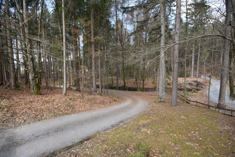Neben der eigenen Zufahrt zum Grundstück, befindet sich ein kleiner Teich.