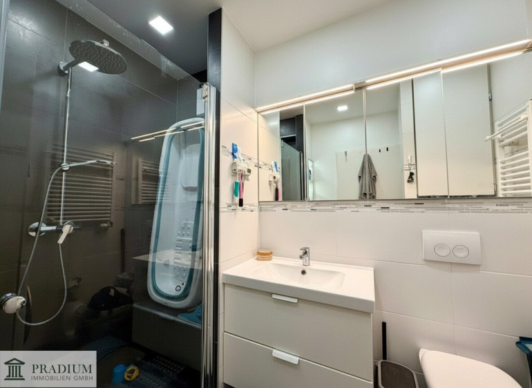 Das Badezimmer ist gepflegt und funktional ausgestattet und verfügt über eine Dusche sowie ein integriertes WC. Die praktische Gestaltung sorgt für Komfort im Alltag und passt sich harmonisch in das Gesamtkonzept der Wohnung ein.