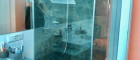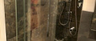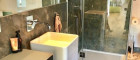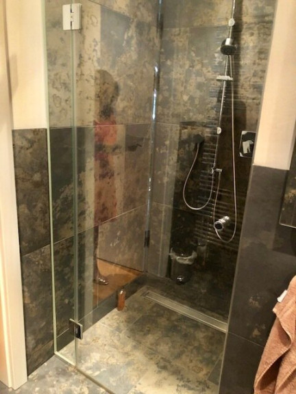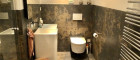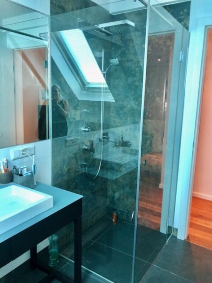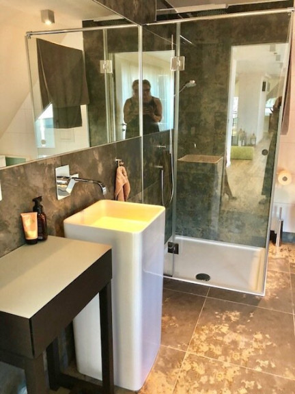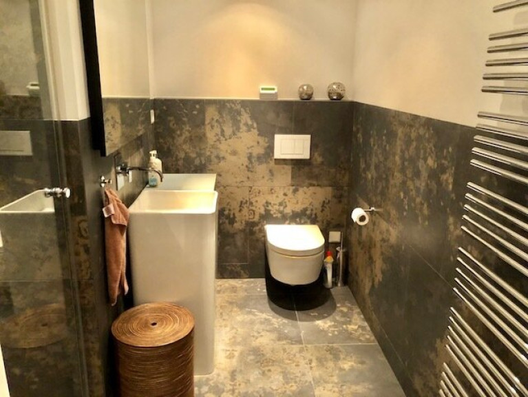 - Bad mit Panoramadusche, Waschbecken und Toilette,