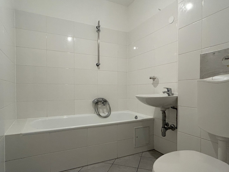Im Badezimmer, welches sich im Eingangsbereich der Wohnung befindet, steht eine Badewanne für den täglichen Einsatz bereit. Das WC ist nebenan, ebenso wie ein praktischer Abstellraum.