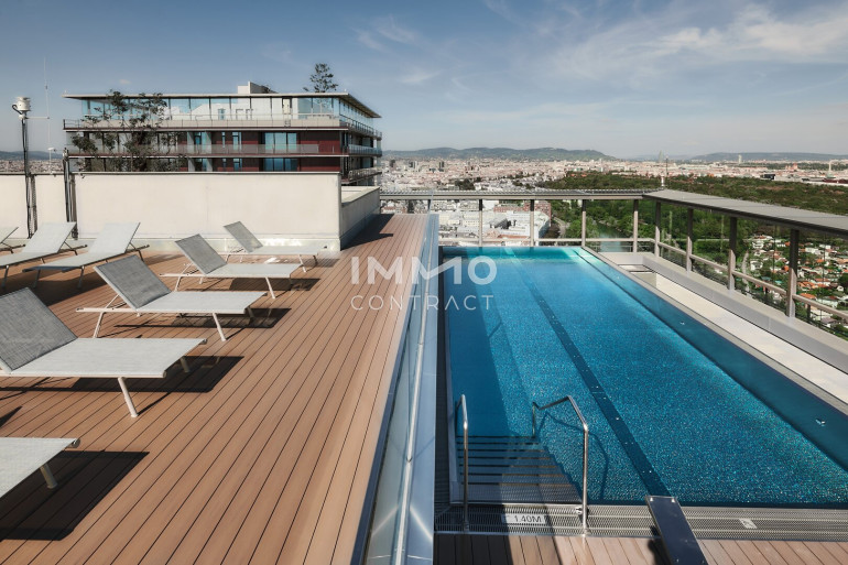 Zusätzliche Highlights des Projekts sind die Eventküche, die sich perfekt für private Feierlichkeiten eignet, sowie die großzügige Gemeinschaftsterrasse, von der aus man einen atemberaubenden Blick auf die Stadt genießt. Für gesellige Abende steht eine BBQ Area bereit, die bequem über eine hauseigene App gebucht werden kann. Das absolute Highlight ist jedoch der Pool auf dem Dach, der nicht nur für Erfrischung sorgt, sondern auch eine spektakuläre Aussicht auf die Stadt und den Prater bietet.
