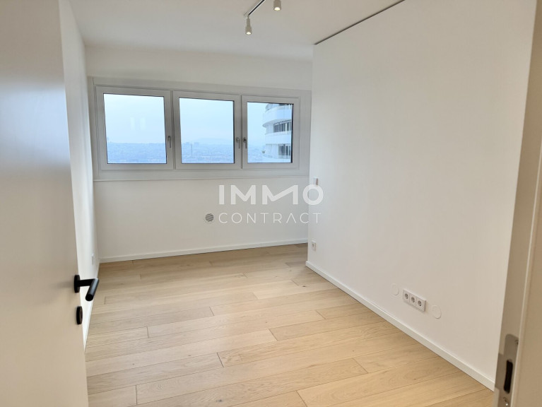 The apartment is characterized by bright, open interiors and a sophisticated finish throughout, creating a harmonious balance between comfort and contemporary design. At its heart lies a spacious living area that seamlessly connects to a generous skyline loggia, offering breathtaking panoramic views across the river and Vienna’s iconic skyline.