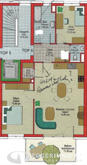 1 Kinderzimmer, 1 Elternschlafzimmer, 1 Abstellraum, 1 Balkon, 1 Kellerabteil, 1 PKW-Tiefgaragenabstellplatz.
