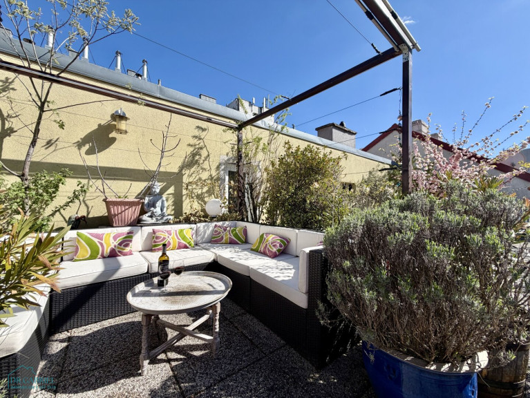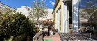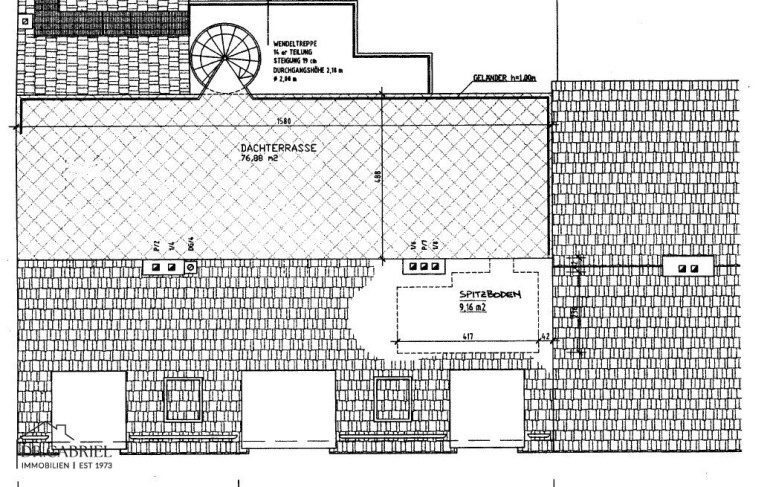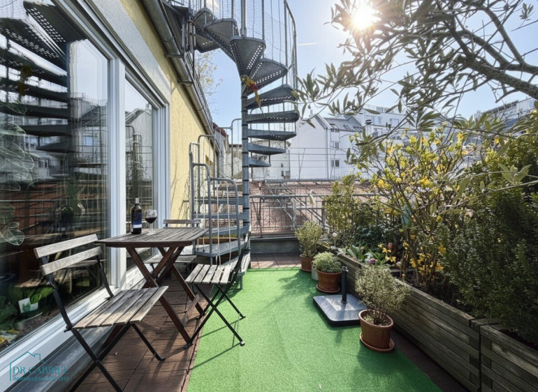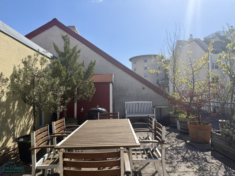 über eine außenliegende Wendeltreppe gelangt man auf die 76,88 m² große Dachterrasse mit Loungebereich und großem Essbereich. Im hinteren Bereich der Terrasse befindet sich ein praktischer kleiner Stauraum im Spitzboden (9,16m²) sowie eine kleine Gartenhütte.