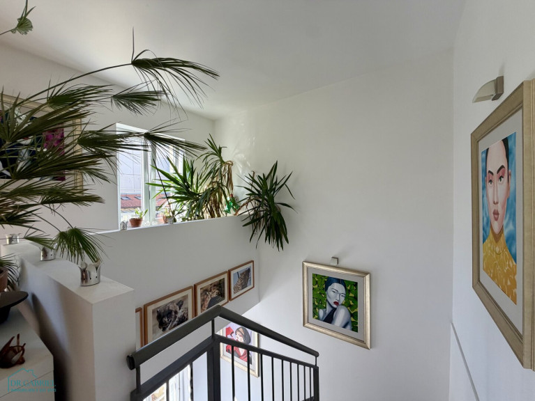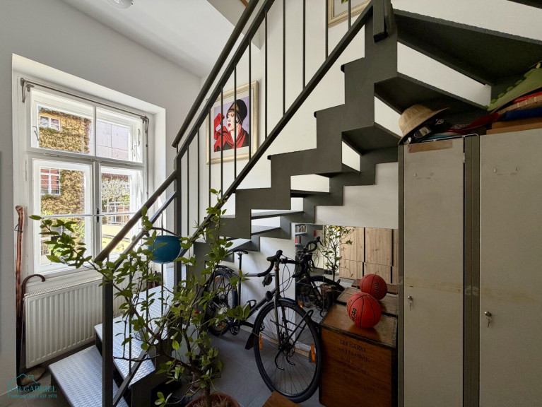 Im ersten Stock befindet sich der Eingang zur Wohnung mit einem großen Vorraum mit viel Staumöglichkeit. Über eine Treppe gelangt man auf die Wohnebene, die sich wie folgt gliedert: