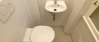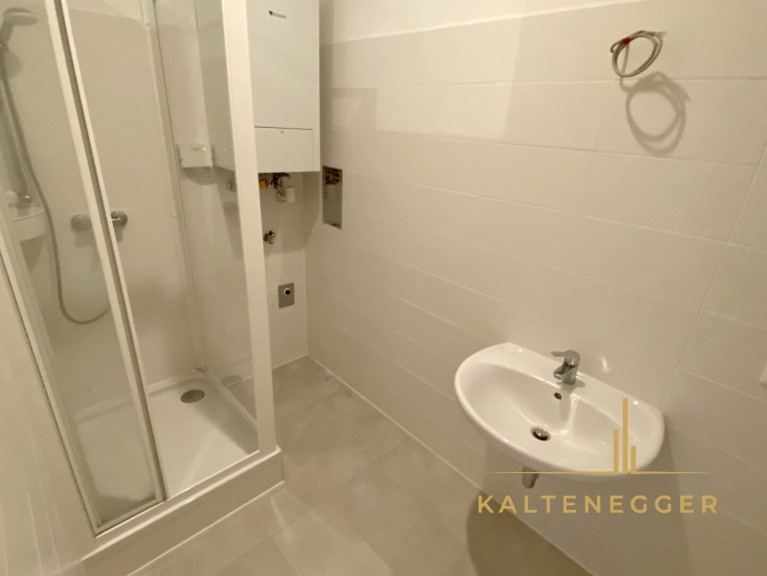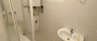 - Badezimmer mit Dusche, Handwaschbecken, Waschmaschinenfixanschluss, Handtuchtrockner