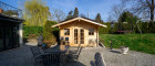 Der uneinsehbare Garten mit großer Terrasse, Spielbereich und gemütlicher Gartenhütte bietet viel Raum für Erholung und gesellige Stunden.