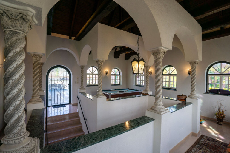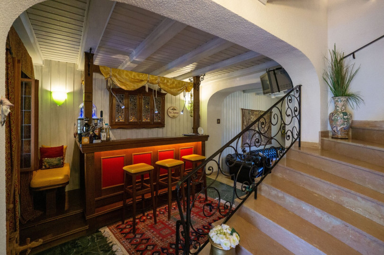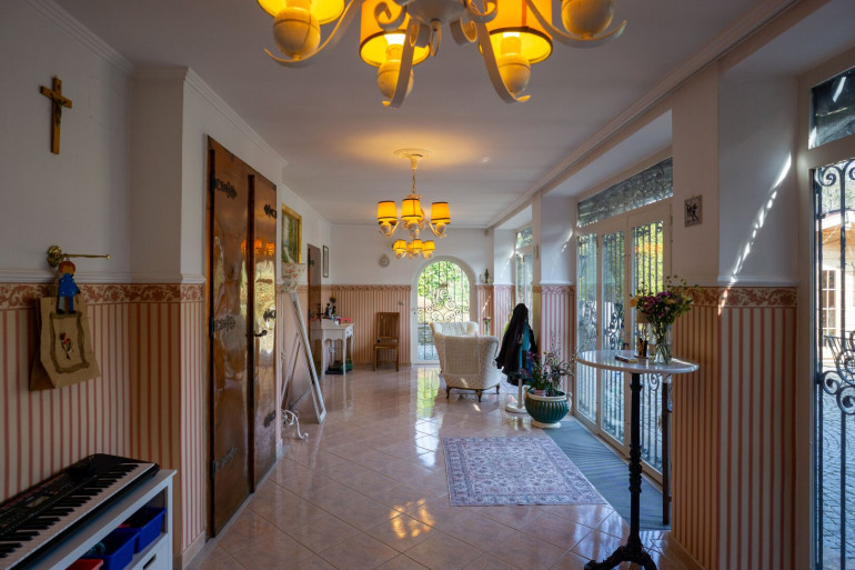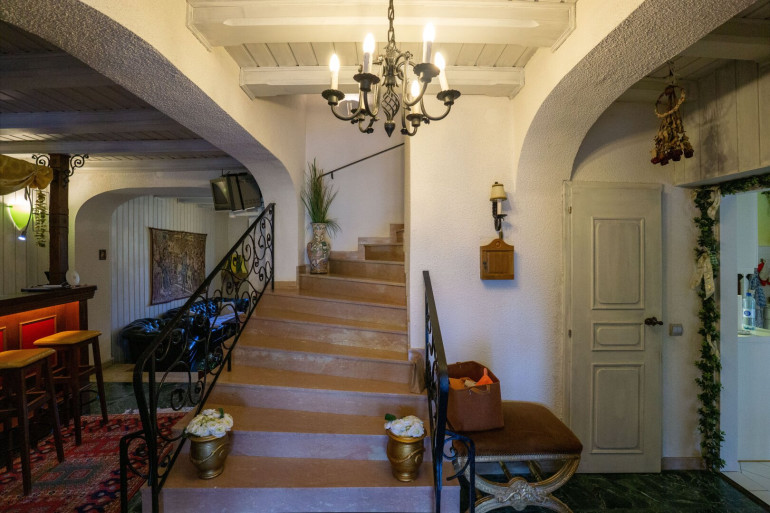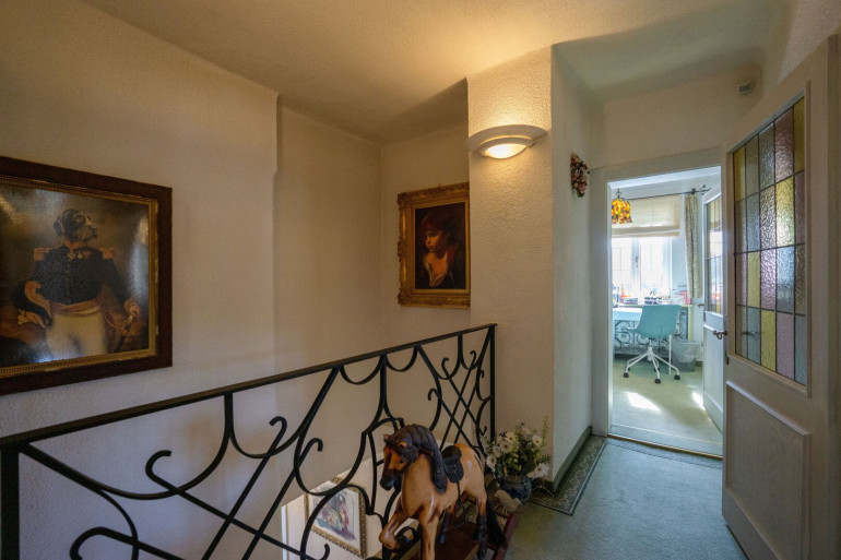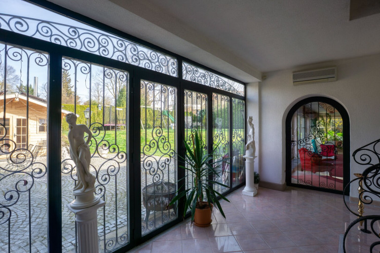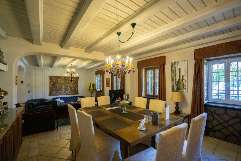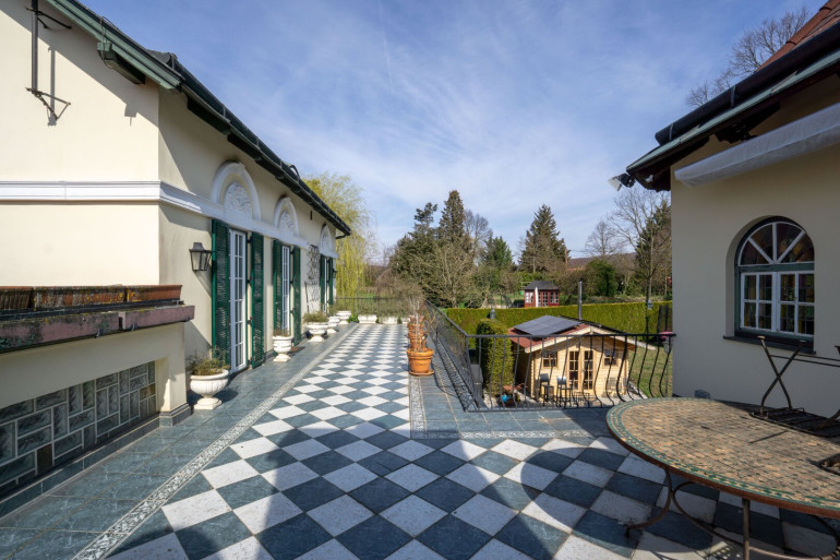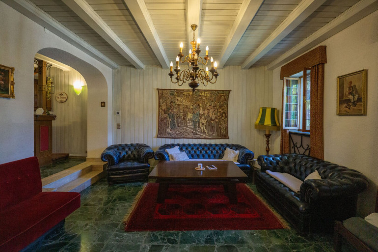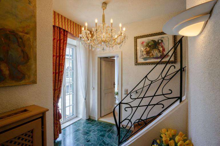 Im Inneren erwarten Sie ein beeindruckendes Foyer mit Glasveranda, ein Wohnbereich mit Bar, Esszimmer, Küche sowie zahlreiche geschmackvolle Räume mit historischen Elementen. Der private Bereich im 1. Stock bietet Schlafzimmer mit Salon, Bad und Arbeitszimmer, ergänzt durch weitere Zimmer im Dachgeschoß.